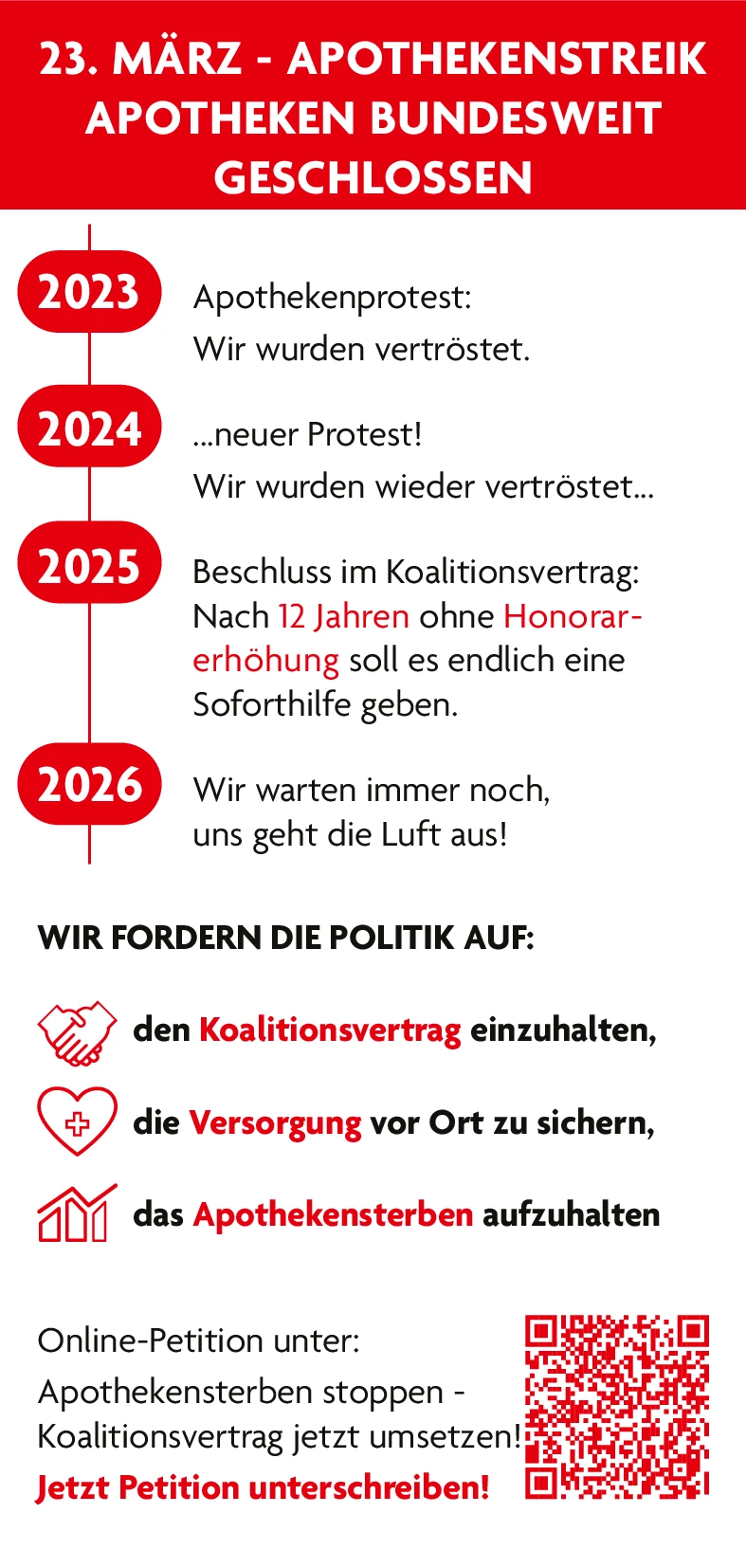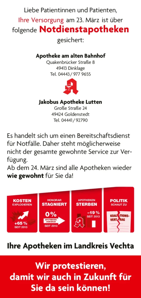 Am 23. März beteiligen wir uns am bundesweiten Protesttag der Apotheken. Warum wir diesen Schritt gehen und was das für Sie bedeutet, erfahren Sie hier.